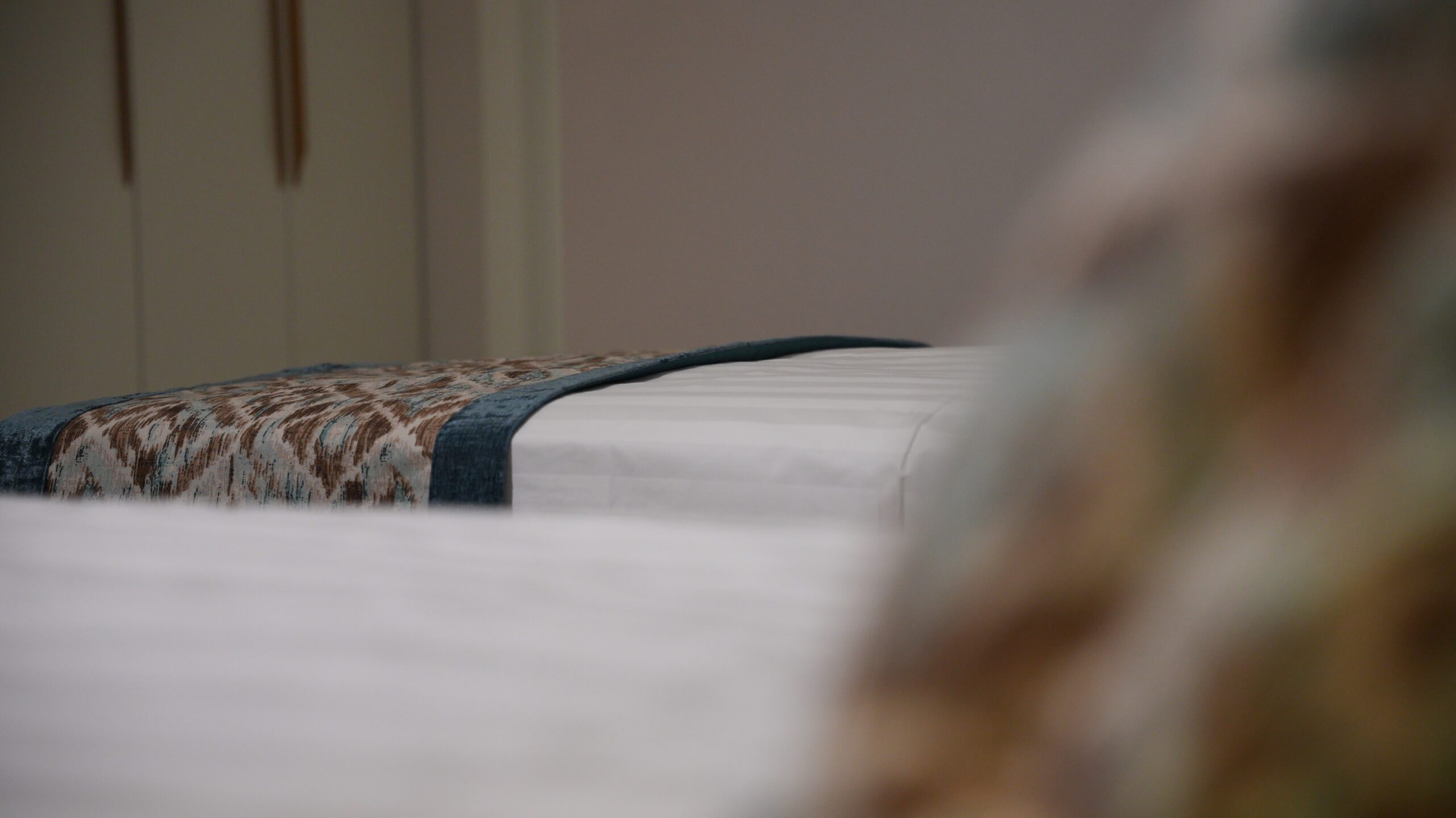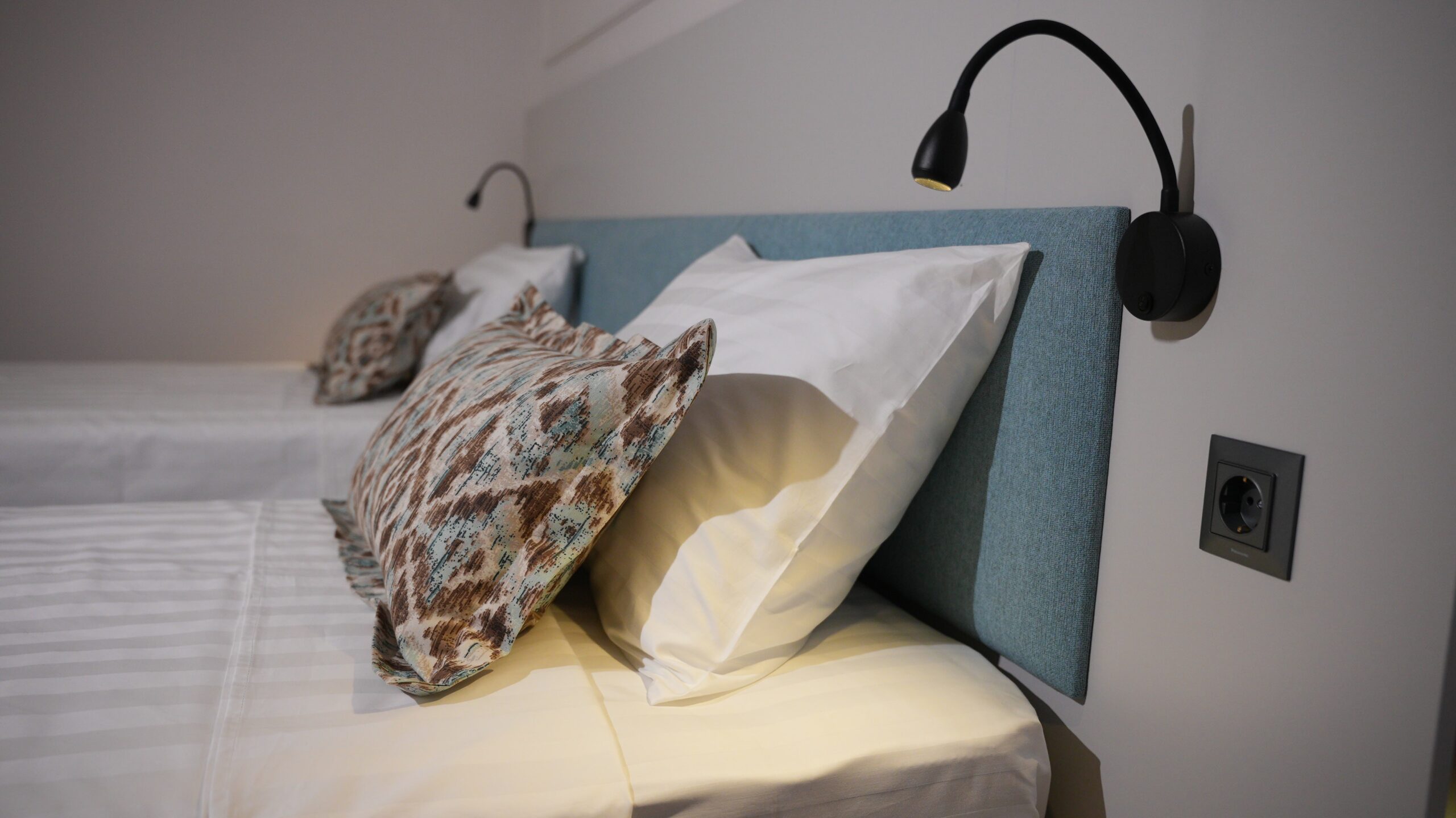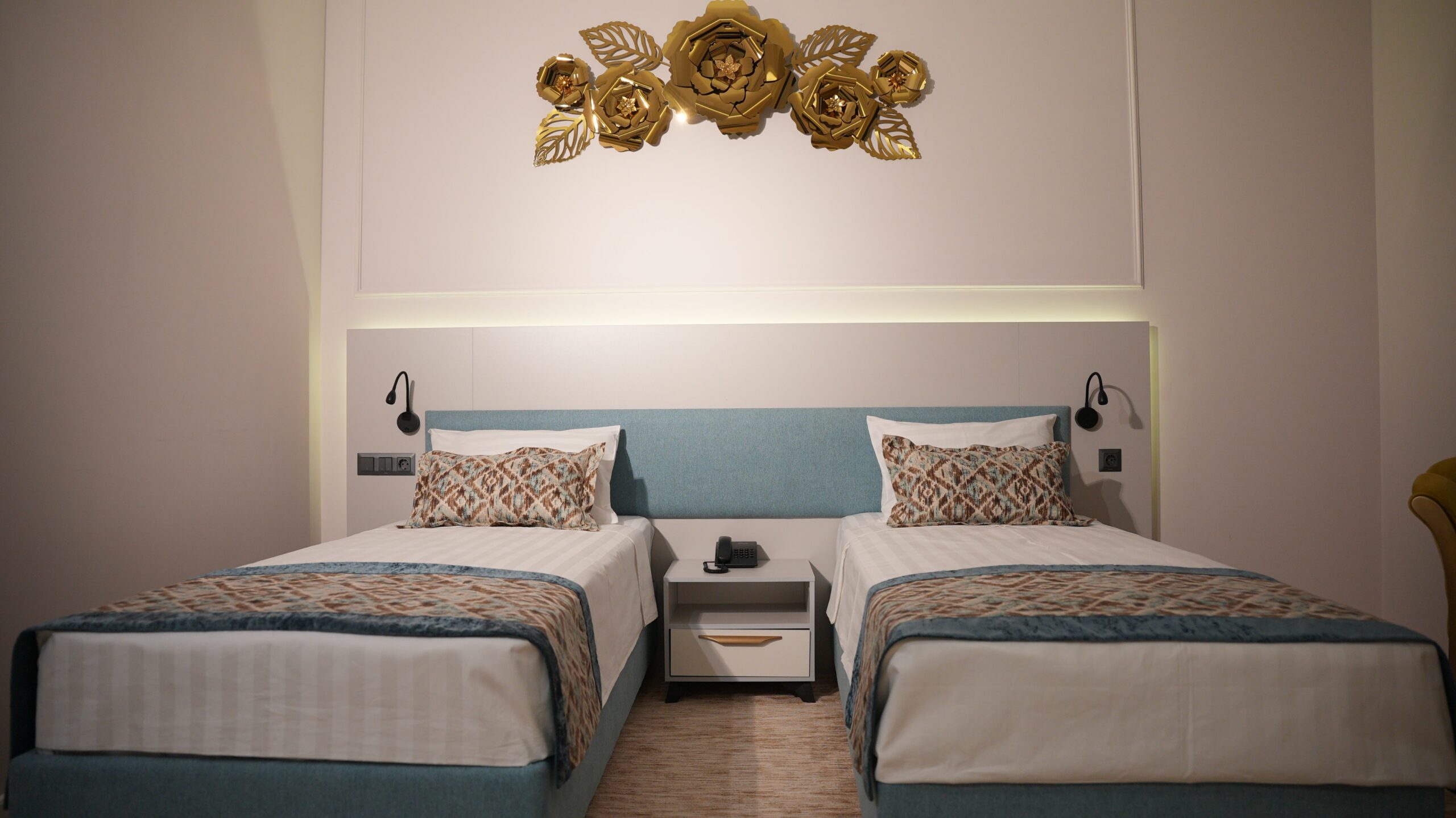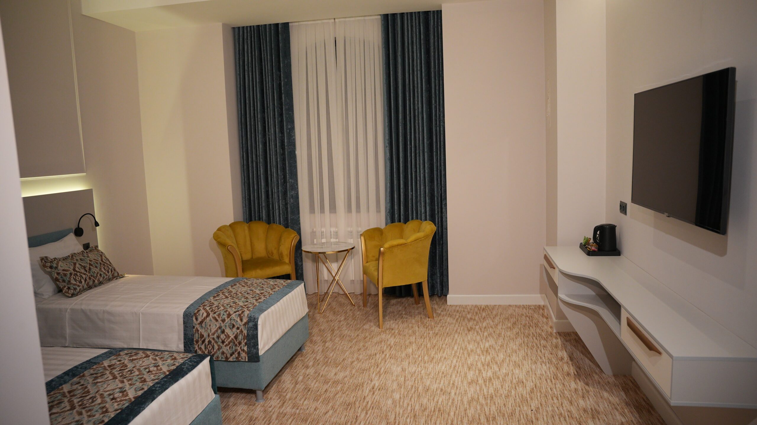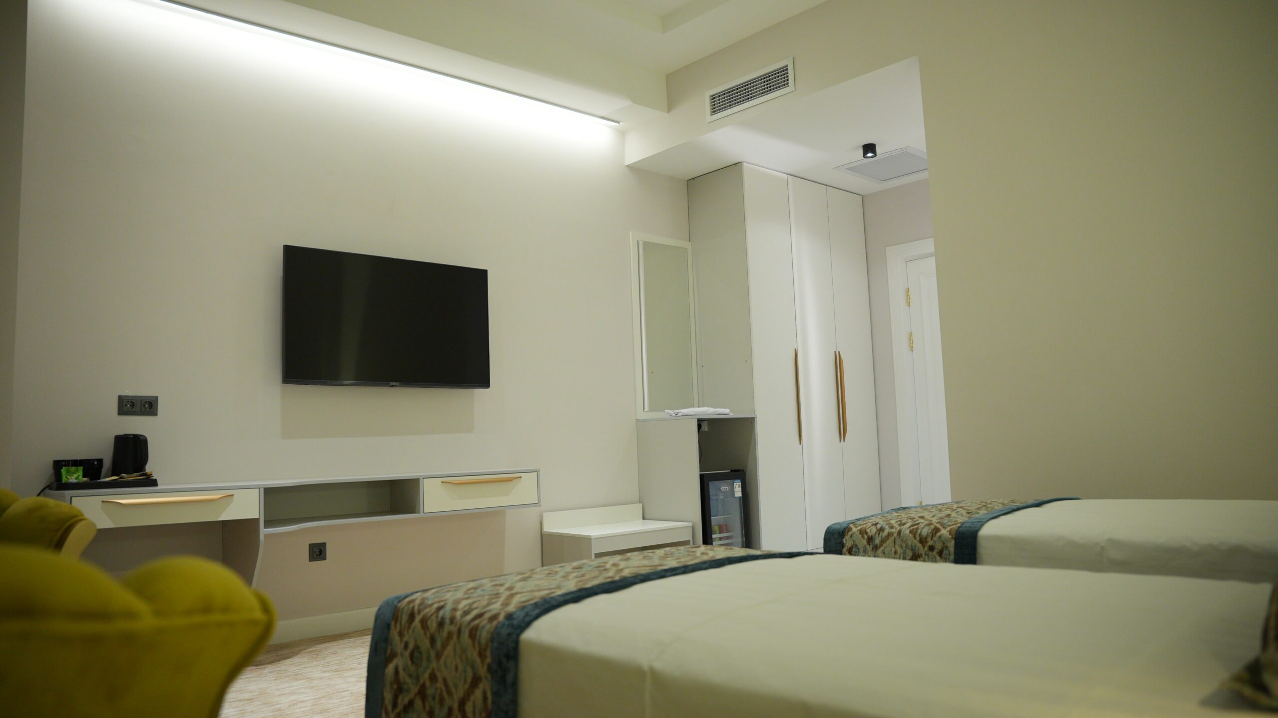 The twin room is ideal for friends, colleagues, or family, offering two comfortable single beds with fresh linens and soft pillows. The room features a sleek, modern design with warm, neutral hues and practical furnishings, including a spacious desk, a flat-screen TV, and ample storage space.